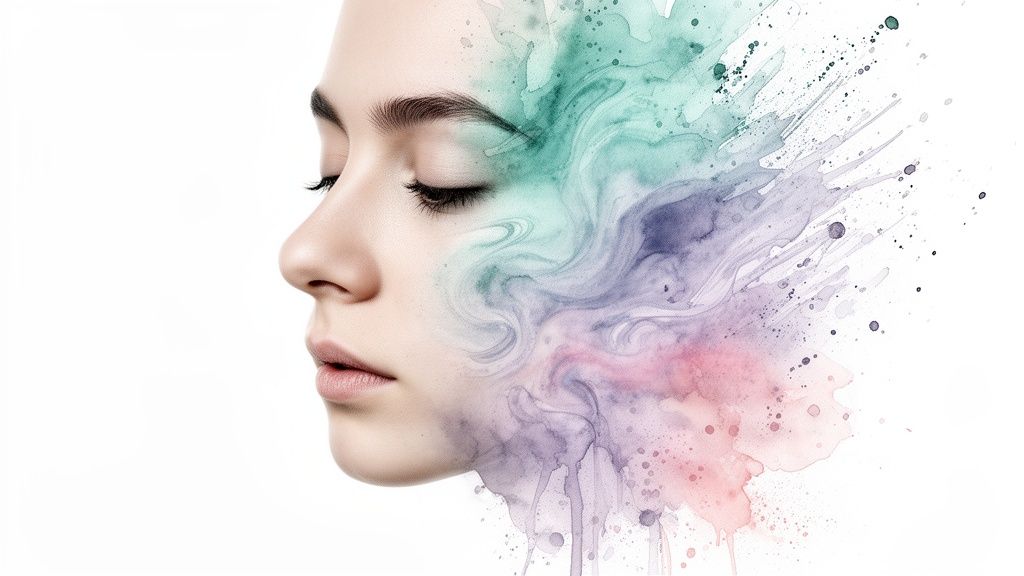 Femme sereine les yeux fermés, main sur la poitrine, halo lumineux et éclaboussures d'aquarelle colorées.