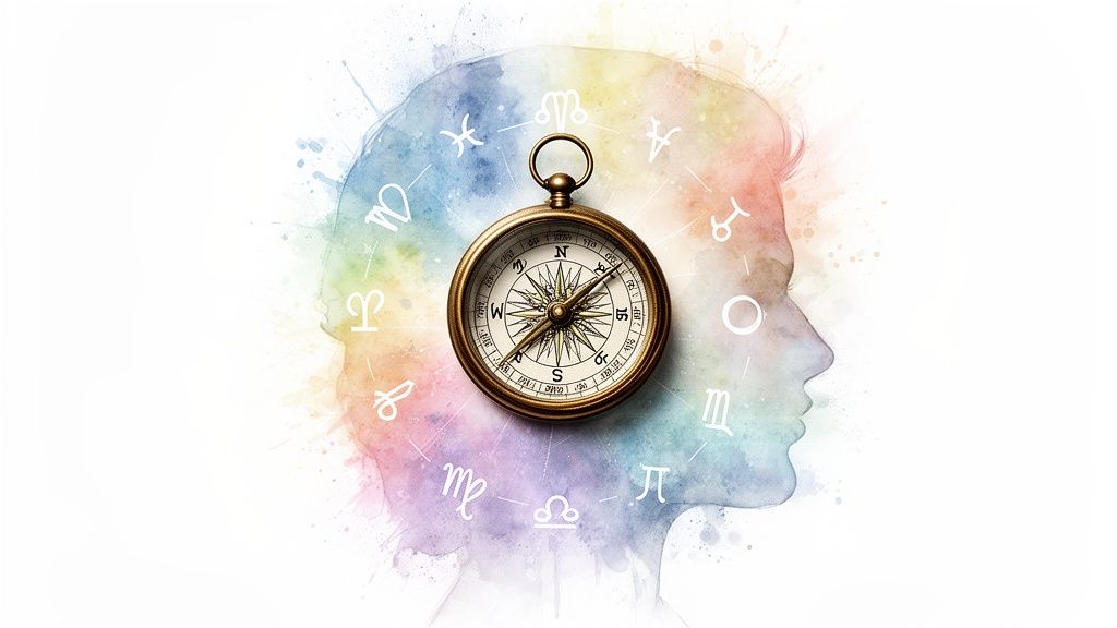 Au fond, qu'est-ce que l'ascendant en astrologie ? C'est bien plus qu'un simple détail technique. Voyez-le comme le signe du zodiaque qui pointait à l'horizon, plein Est, à la minute même de votre premier souffle. C'est la porte d'entrée de votre thème astral, la toute première énergie que vous projetez sur le monde, de façon tout à fait instinctive.
